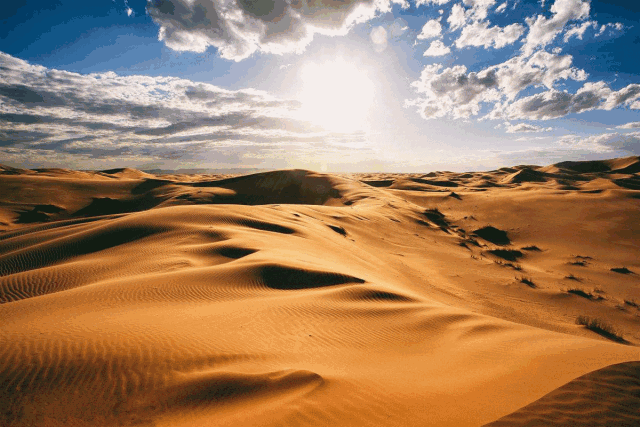 Camels walk in the desert, mountains and rivers, clouds and blue sky
